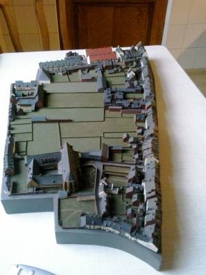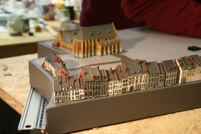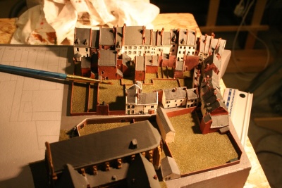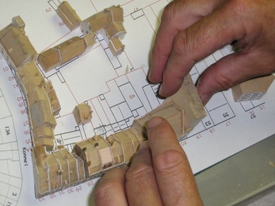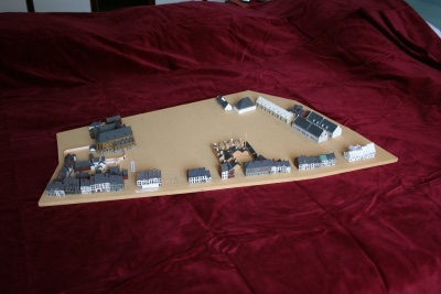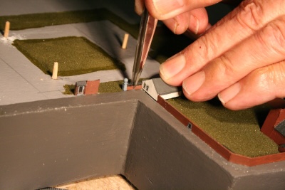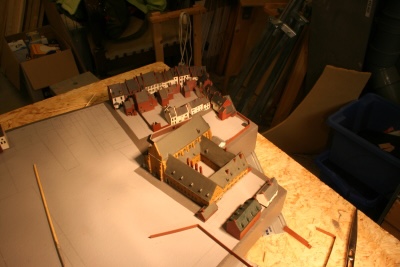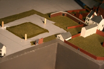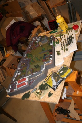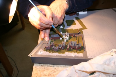 Nu volgt de afwerking, zoals het plaatsen van de gebouwen en afscheidingsmuren en het inkleuren van de ondergrond.