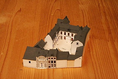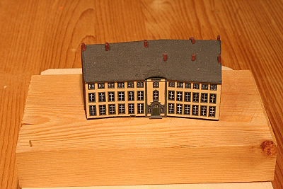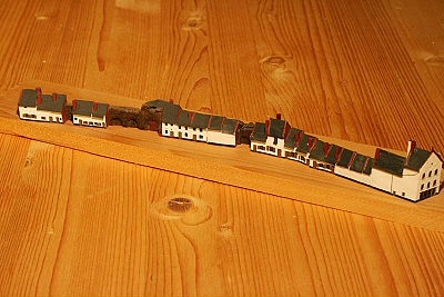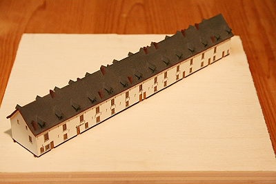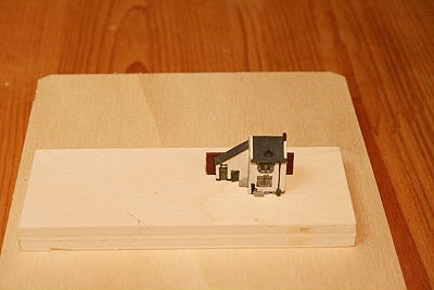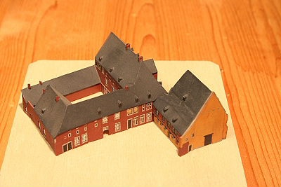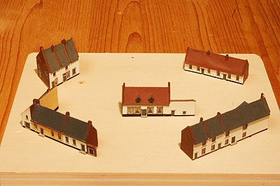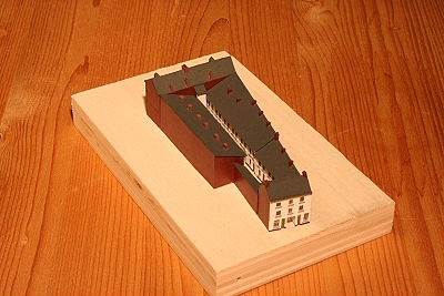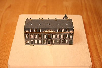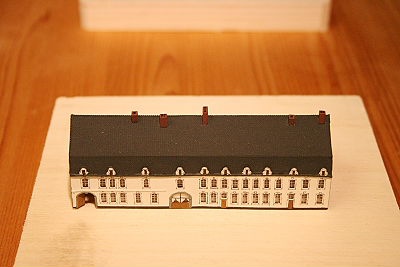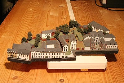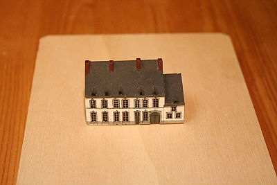 Het miniatuurtje is verder uitgewerkt dan de andere, omdat goed te reconstrueren was hoe het huisje eruit zag in de 19e eeuw. De regenton, de gevelsteen met zwarte hond, de buitentrap en het kelderluik zijn voor de goede kijker zichtbaar.