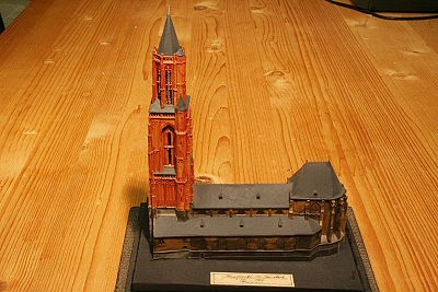 Een enorm praalgraf in het koor van de kerk doorbreekt deze rust echter op een opmerkelijke manier (het praalgraf is niet zichtbaar in de miniatuur).