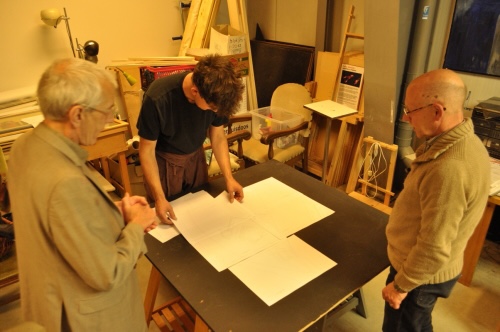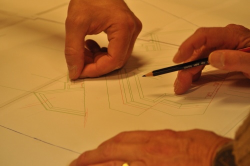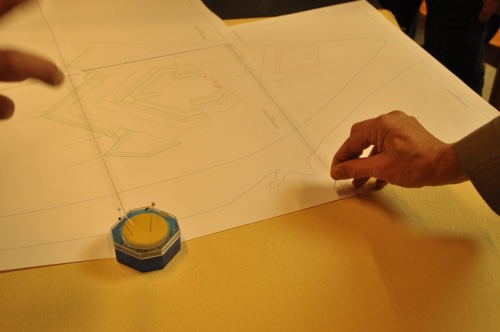 Het profiel wordt daarna door de opzichter (l) de uitvoerder (M) en de toezichthouder (r) samengesteld en
