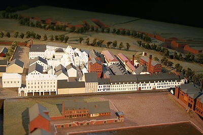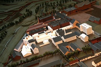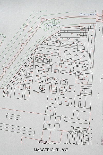 Duidelijk is te zien dat de walmuur en de vestingwerken niet alleen belegeraars tegen hield maar ook de Sphinx-fabriek.
