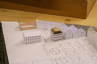 Daarna wordt er een eenvoudig gebouw gemaakt, waarmee een provisorische opstelling gemaakt wordt om te controleren of de maten overeenkomen met de foto.